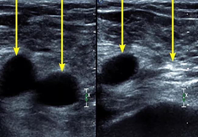 Figure 3. Example of lower-extremity duplex ultrasonography. Arteries and veins are labeled. Veins without deep vein thrombosis are compressible, as seen on the left. A vein is shown that is not compressible, suggesting deep vein thrombosis.
