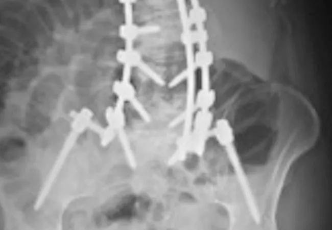 We performed this six-hour procedure using a posterior approach. The spine was exposed from T4 to the sacrum. We then performed a decompression from L1 to L5 to address her spinal stenosis. Posterior column osteotomies (complete facet resections) at L1-L2, L2-L3, L3-L4 and L4-L5 helped mobilize the arthritic spine. Pedicle screw instrumentation was placed from T4 to the sacrum, and we used iliac fixation to strengthen the construct. Various maneuvers were used to correct the severe deformity, and then cobalt chrome rods were placed to hold the correction (Figures 2A, B).