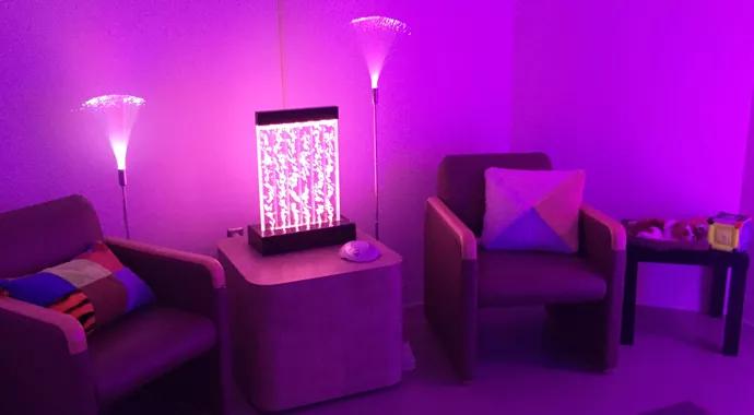 “If a member of the caregiving team sees somebody who is pacing or showing high anxiety or early agitation, they can suggest the patient go into the calming room,” says Hogan. During the first visit, the caregiver shows the patient all of the options. Then, patients choose the stimulation mode that appeals to them.