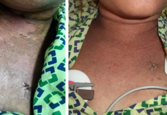 She was diagnosed with an allergy at an outpatient clinic and received oral antihistamines, but with no improvement. In fact, the patient continued to worsen and developed additional symptoms of dyspnea, chills, fever and cough. She was admitted to an outside hospital for respiratory failure. After 14 days, she was transferred to Cleveland Clinic.