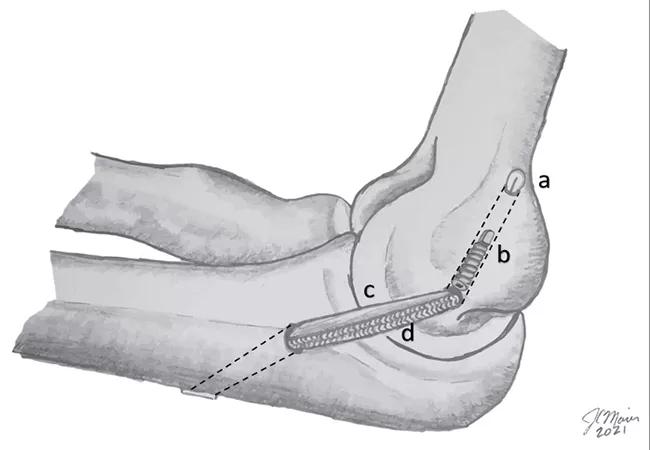 Today we are testing a surgical technique that combines a novel UCL reconstruction method and internal bracing to reinforce the medial elbow after reconstruction (Figure 2). This technique uses dual suspensory fixation on the humerus and ulna to minimize the most common methods of failure: bone tunnel fracture and suture breakage. It also gives the surgeon better control of graft tensioning.
