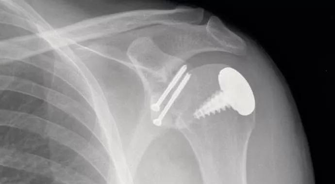 Figure 2. Postoperative radiograph of a patient with recurrent shoulder instability treated with a combined Latarjet procedure and a partial cap resurfacing implant for a Hill-Sachs defect