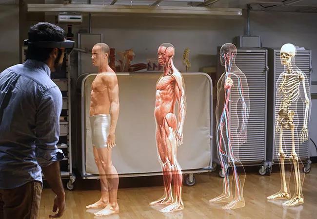 Microsoft HoloLens technology creates a 3D image of the human body that appears to float in the air, right in front of you. You can reach out, and using your fingers, peel away skin and tissue and study every organ and body process in lifelike detail. You can remove individual organs and investigate their inner workings. You can see labels and explanations of what you’re seeing, as you study it. And yes, you can move your holographic model to peer into it from angles that even the most experienced surgeons would not see in anything but their wildest dreams.