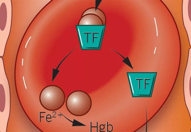 In the plasma, iron is bound to transferrin, and under normal circumstances one-third of transferrin is saturated with iron. Transferrin receptors are present on most cells but are most dense on erythroid precursors. Each transferrin receptor can bind two transferrin molecules. After binding to transferrin, the transferrin receptor is endocytosed, and the iron is released into acidified vacuoles. The transferrin-receptor complex is then recycled to the surface.