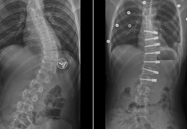 Feature image: 13-year-old female with progressive scoliosis treated with vertebral body tethering. Images show early correction from the preoperative posteroanterior x-ray and the patient’s first erect postoperative posteroanterior x-ray.