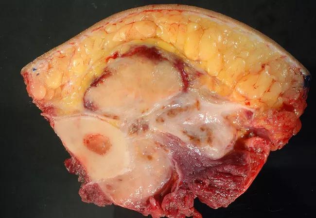 Figure 5. Gross cross-section of the resection specimen, showing the tumor surrounding the bone and invading both sides of the investing calf fascia.