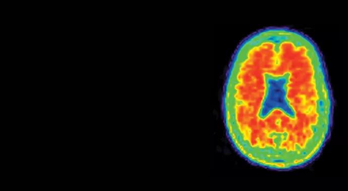 Figure 2. PET brain imaging with florbetapir in a normal individual (left) and showing amyloid accumulation in a patient with AD (right).