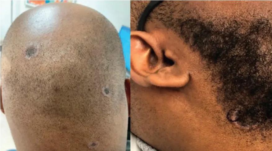 on the scalp, right mandibular angle and penis. No lesions were observed on the oral mucosa, palms, or soles. No lymphadenopathy or new-onset alopecia was present.
