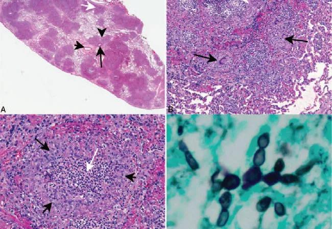 Surgical lung biopsy. (A) Scanning magnification showing a nodular, bronchopneumonia-like histologic picture (hematoxylin and eosin, X0.5). Short arrow: small pulmonary artery branch, long arrow: bronchiole, arrowhead: inflammatory infiltrate causing consolidation in peribronchiolar lung. The area indicated by the white arrow is shown at higher magnification in B. (B) High magnification shows occasional nonnecrotizing granulomas (black arrows) similar to those seen in the prior transbronchial biopsy adjacent to larger suppurative granuloma (white arrow). (C) Suppurative granuloma at high magnification. Black arrows: granulomatous rim, white arrow: suppurative necrosis (hematoxylin and eosin, X200). (D) Fungal pseudohyphae and a few yeasts were seen in the suppurative areas on Grocott methenamine silver stain (original magnification X1200).