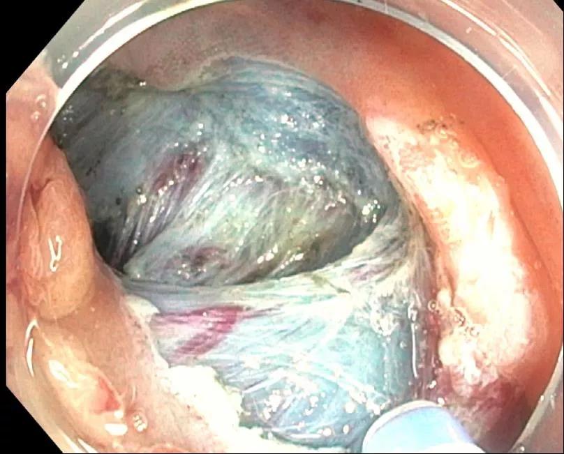 The 10-cm by 10-cm lesion was retrieved using an endoscopic net device and sent for histopathological analysis. Dr. Gorgun inspected the resected margins for hemostasis and any full-thickness or muscular-layer breaches requiring repair. Three 17-mm hemoclips were applied apposed to the underlying muscular layer.
