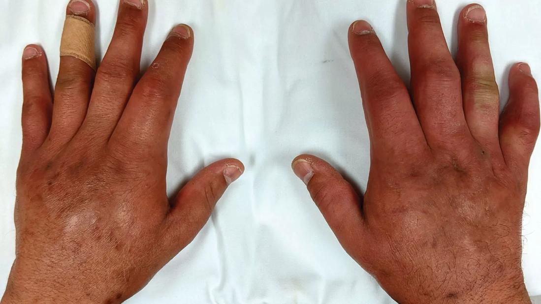 Both hands, including fingers and wrists, were diffusely swollen, with limited range of motion.
