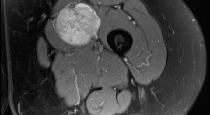 A 62-year-old woman noticed a lump in her thigh. When the tumor did not resolve, she went to her medical doctor, who obtained a CT and referred her to one of the surgeons (S.A.L.) in Cleveland Clinic’s Musculoskeletal Tumor Center. The patient had severe claustrophobia, so she underwent MRI under anesthesia. In addition, a deep vein thrombosis was discovered at the area of the tumor, so an inferior vena cava filter was placed. She was started on enoxaparin but could not tolerate the injections, so she was switched to aspirin, 325 mg twice daily. Based on the MRI findings (Figure), her lesion was believed to be a leiomyosarcoma of the femoral vein, which was confirmed by a minimally invasive needle biopsy.