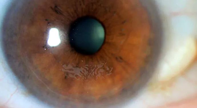 At the one-week follow-up, the patient had an UCVA OD of 20/20 OD. However, the patient returned six months later reporting a gradual reduction in distance vision while driving. His UDVA was 20/60-2 OD. BCVA was 20/15 OD with a manifest refraction of + 1.00 + 1.50 @ 175, indicating a hyperopic shift and induced astigmatism. No diabetic lens changes were noted, but topography indicated focal flattening within the ablation zone [Figure 5]. Slit lamp examination revealed the finding shown in the next image [Figure 6].