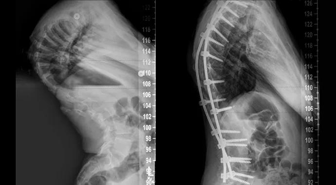 Radiographs and photographs of the case patient at presentation (left) and after spinal fusion and rehabilitation (right).