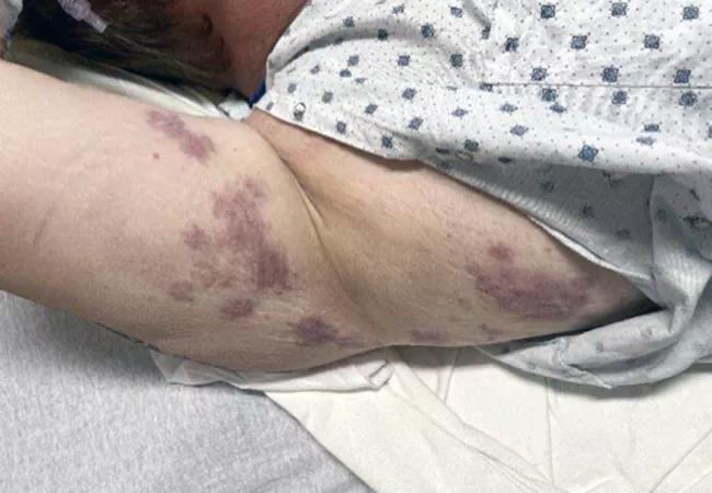 Above: The patient’s raised lesions left hyperpigmented areas that looked like bruising.
