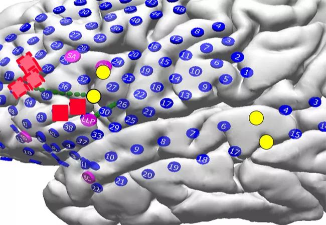 Sublobar resection of the left pars orbitalis was undertaken. The resection was limited to the area defined as abnormal on MRI and epileptogenic on subdural EEG, while sparing language areas identified by cortical stimulation (see map below). Although a common dogma in neurosurgery is to stay at least 1 cm away from eloquent cortex, this is not necessarily justified. In this case, clear anatomical boundaries (the sulci) defined the extent of the language areas and allowed the surgeon to resect to their limit.
