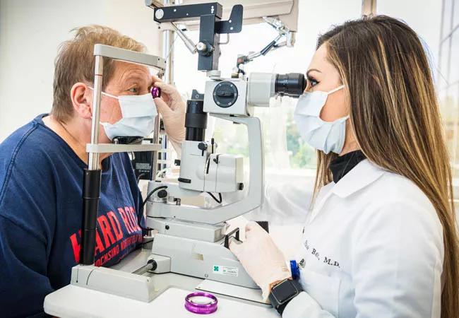Pictured above: Nicole Bajic, MD, an ophthalmologist at Cleveland Clinic Cole Eye Institute, examines a patient one month after endarterectomy. An 85% blockage in the patient’s left carotid artery had caused visual aura originally thought to be ocular migraine.
