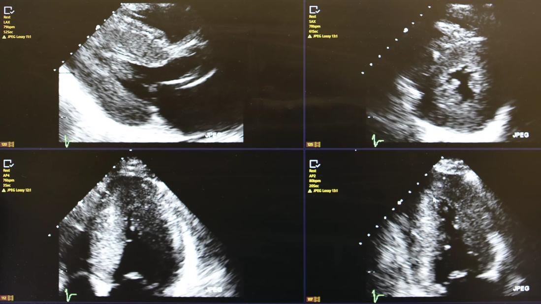Echocardiogram demonstrating left ventricular hypertrophy and typical bright speckled appearance. Though very suggestive of ATTR cardiac amyloidosis, it is not sufficient. Only myocardial biopsy or positive pyrophosphate scan may confirm the diagnosis.