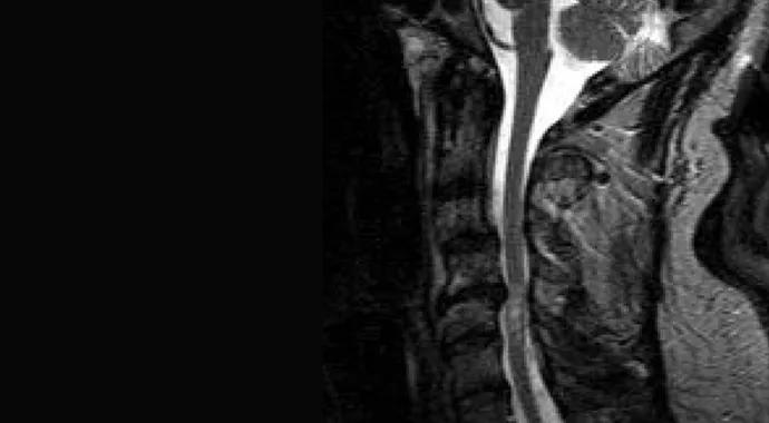 Figure. Sagittal T2-weighted MRI of a patient with MS and cervical stenosis with myelopathy.