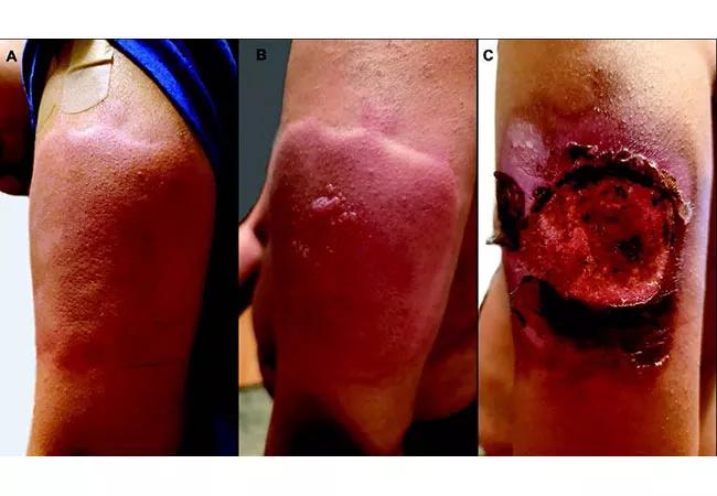 In our experience, nonconfluent rashes, rashes involving the lateral arm, or rashes involving other anatomic locations close to the injection site may also occur. Notably, when looking at all cutaneous reactions in the above-mentioned study, 43% of patients who initially had a cutaneous reaction developed another cutaneous reaction after the second dose.