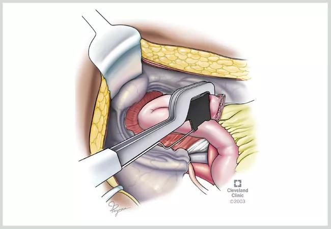 Figure 1. Stapled closure of the tip of the J-pouch. A technique felt by many to prevent this complication is to staple the tip of the J at an acute angle to improve the perfusion (blood supply) to the tip of the J which is the most distal part of the new J-pouch. This technique may also be used to make a new tip of the J-pouch during a pouch revision for a tip of the J leak. After the stapled tip of J construction, the staple line is often oversewn, again to prevent a leak (not shown). ©Cleveland Clinic, 2023