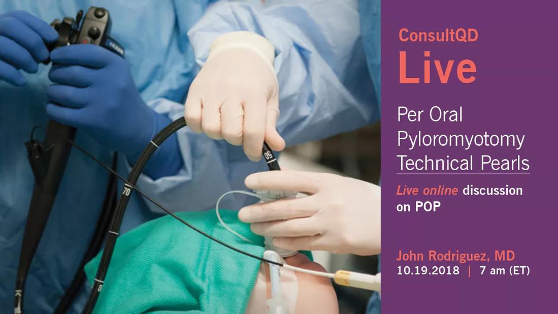 On Friday, Oct. 19 at 7 a.m. (ET), John Rodriguez, MD, will host a live presentation on per oral pyloromyotomy (POP) – an innovative technique for treating gastroparesis.