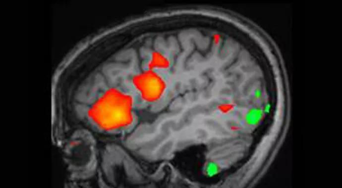 FIGURE 1. Schematic illustration of cortical activation revealed with functional MRI within the left basal frontal lobe and anterior insula. Areas of interest are superimposed on sagittal and axial images of the patient’s structural MRI. Red indicates activation; green indicates deactivation.