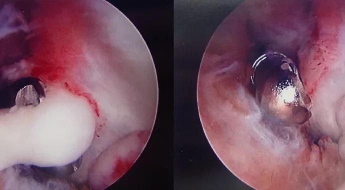 Figure 3. Arthroscopic view of an elbow with abundant soft tissue adhesions (left). Arthroscopic lysis of adhesions (middle) and debridement (right).