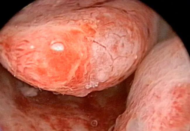 Hysteroscopic image of two submucosal fibroids. A 46-year-old woman presented with incessant vaginal bleeding. After undergoing a brief outpatient hysteroscopic myomectomy, her menstrual cycles returned to normal.