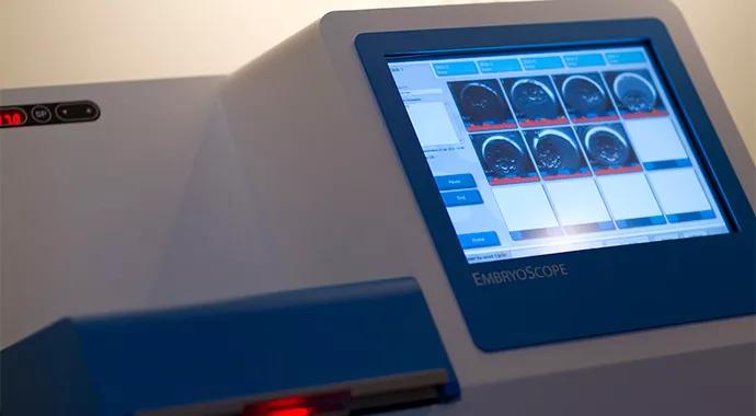 In 2012 Cleveland Clinic’s IVF laboratory acquired its first time-lapse imaging system, the EmbryoScope® (Unisense Fertilitech, Denmark). This elegantly engineered instrument is an incubator with a built-in microscope and high-definition camera, allowing continuous monitoring of embryo growth. The chamber design and camera software allow imaging of as many as 72 embryos (six patient slides with 12 embryos apiece) in five focal planes every 15 minutes.