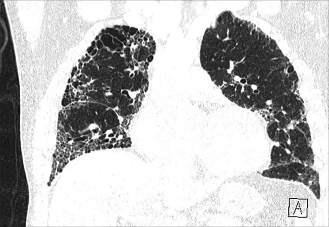 Feature image: A patient with combined pulmonary fibrosis and emphysema. In patients with findings consistent with underlying structural lung disease, further diagnostic testing for pulmonary arterial hypertension may not be warranted.
