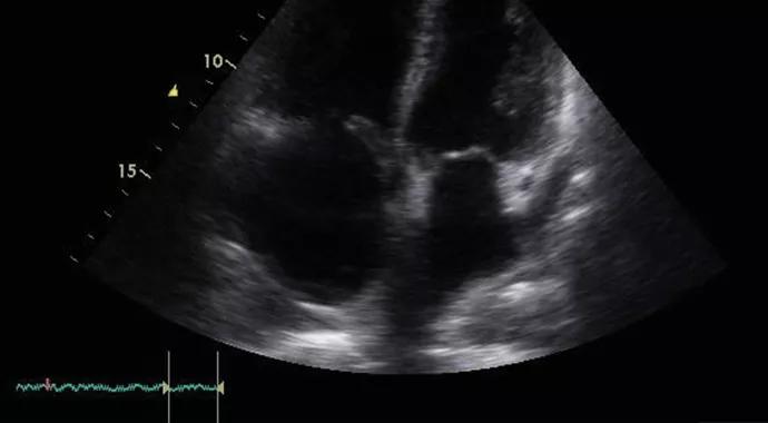 Figure 1. Transthoracic echocardiogram (apical four-chamber view) in a 66-year-old man with polymyositis associated with antisynthetase (anti-Jo-1) syndrome. The right ventricle (RV) is severely dilated, and the right atrial cavity (RA) is also dilated. The left ventricle (LV) and left atrium (LA) are normal in size and systolic function