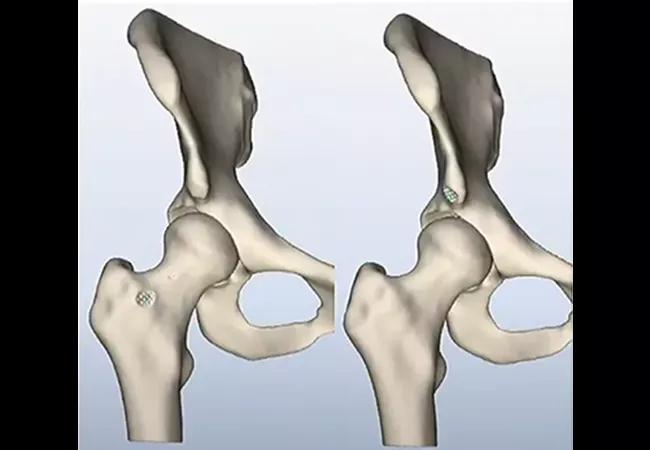 3D study images show intertrochanteric and subspine areas of femoral acetabular impingement. “Of key note on the 3D studies,” says Dr. Kamath “is the low femoral version 2.2 degrees, which is relative retroversion of the femur, when compared to normative female populations of this age.”