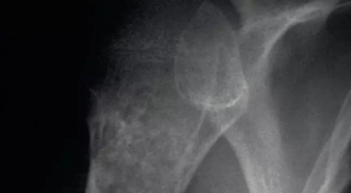Figure 3. Radiograph showing a chondroid tumor in the proximal humerus with endosteal scalloping, cortical destruction, periostitis and calcifications consistent with chondrosarcoma.