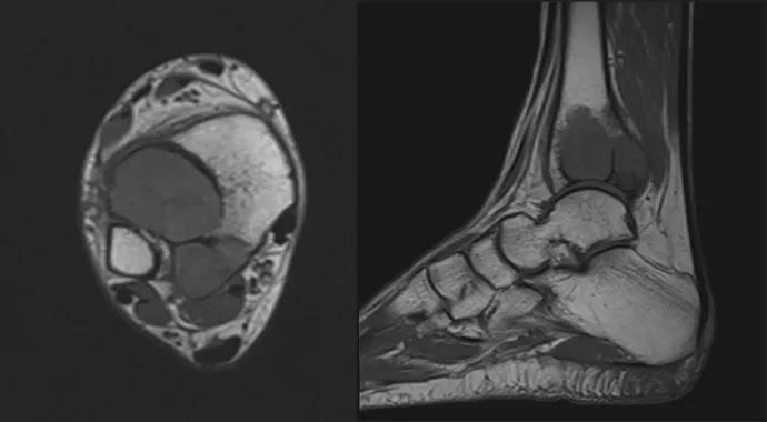 H.C. is a 35-year-old woman who had a giant cell tumor of bone removed at an outside institution. She came to Cleveland Clinic for follow-up several years after that index surgery. She had noted a subtle increase in pain, and radiographs revealed lytic lesions in the distal tibia (Figure 2), so we obtained MRIs based on concerns about the degree of bone resorption in her distal tibia. The MRIs revealed what appeared to be a recurrence of her giant cell tumor with aneurysmal bone cyst components (Figure 2).