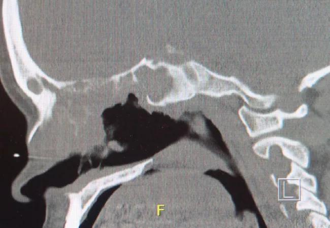 Figure 1. Computed tomography axial view showing loss of the nasal septum and reactive bony thickening (neo-ossification) of the maxillary sinuses. Figure 2. Computed tomography lateral view showing absence of the nasal septum and evidence of collapse of the external nasal bridge.