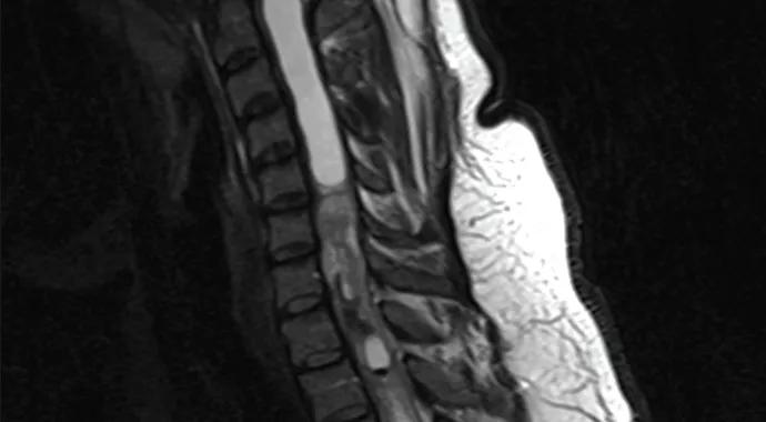 Sometimes life comes at our patients fast. Consider Kristen, a young lady who sought care at Cleveland Clinic’s Center for Spine Health a few years ago, when she was 28. Life was quite good for Kristen: She had married Nick in 2009, and they shared dreams of having a family and building a fulfilling life together. Her zest for life was palpable. Suddenly, however, her world began to collapse. First she had a miscarriage eight weeks into her first pregnancy. Then she had a skin lesion removed that proved to be malignant melanoma. Throughout all this, she was experiencing escalating neck pain, which she largely ignored because of all her other stressors. As the pain progressively worsened, she developed problems with balance and coordination. MRI of her spine revealed yet another problem — an intramedullary cervical spine tumor (i.e., within the substance of the spinal cord; Figure 1).