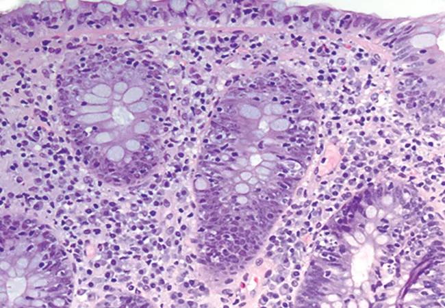 Histologically, ICI-associated colitis is characterized by both acute and chronic changes, including an increased number of neutrophils and lymphocytes in the epithelium and lamina propria, erosions, ulcers, crypt abscess, crypt apoptosis, crypt distortion, and even noncaseating granulomas.13 However, transmural disease is rare. Figure 2 compares the histopathologic features of ICI-associated colitis and a normal colon.