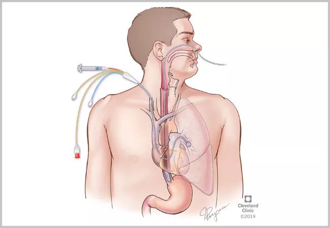 The measurement of the esophageal pressure is obtained by placing a flexible tube through the nose into the lower esophagus using local anesthetics (figure 1). Adequate position of the catheter is established by following certain criteria.3 The end-expiration esophageal pressure measurements can be obtained by the same hemodynamic system used to record the pulmonary pressures. Both end-expiration mean pulmonary and PAWP are then adjusted by the same absolute value (figure 2). Since pulmonary pressures are equally affected by the intrathoracic pressure, the adjustment by esophageal pressure does not affect the transpulmonary gradient (TPG: mean pulmonary artery – PAWP) or pulmonary vascular resistance (TPG/CO).