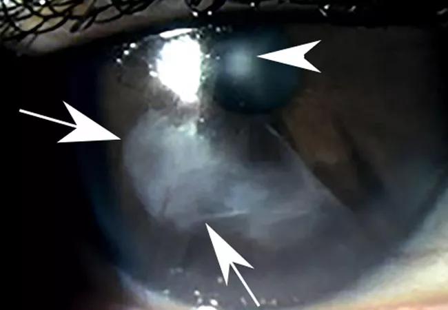 Topical losartan treatment of progressive fibrosis in a radial keratotomy incision. A. Years after radial keratotomy, a patient reported decreasing uncorrected and best-corrected vision. The patient’s cornea was found to have developed progressive fibrosis within and surrounding an inferior incision. B. After one drop of 0.8 mg/mL losartan in balanced salt solution six times per day for 15 days, there was already a notable decrease in scarring fibrosis (arrows) and improvement in both uncorrected and best spectacle-corrected vision in the eye. The arrowhead is an artifact related to the light reflex during photography. Images provided by the treating physicians Rodrigo Carlos de Oliveira, MD, and Luiz Antônio Vieira, MD, São Paulo, Brazil. Mag. 15X. Reprinted with permission from the Journal of Ocular Pharmacology and Therapeutics. doi:10.1089/jop.2022.0174.