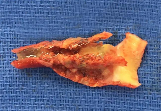 The resected atherosclerotic carotid artery stent shown above was recently removed from a patient who had undergone a carotid endarterectomy in 1994 and then had a carotid stent placed in 2004 for recurrent carotid stenosis. The earlier procedures were done at outside institutions, but the patient was referred to Cleveland Clinic’s Department of Vascular Surgery at age 63 for greater than 90 percent stenosis within her stent, attributable to atherosclerosis.