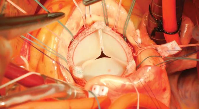 The following intraoperative images show essential steps in the implantation of a promising advance in aortic valve replacement: the advent of a two-part aortic bioprosthetic valve — namely, the ValveXchange Vitality™ aortic bioprosthesis.