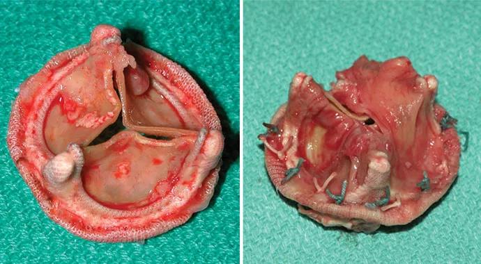 In contrast, aggressive organisms, such as Staphylococcus aureus, can cause rapid, extensive tissue destruction, usually within a few weeks, with formation of large vegetations. Panels 2 to 4 show a tissue valve (2) and a mechanical valve (3) infected by S. aureus and extensive tissue destruction with aortic root abscess (4) caused by S. aureus prosthetic valve endocarditis.
