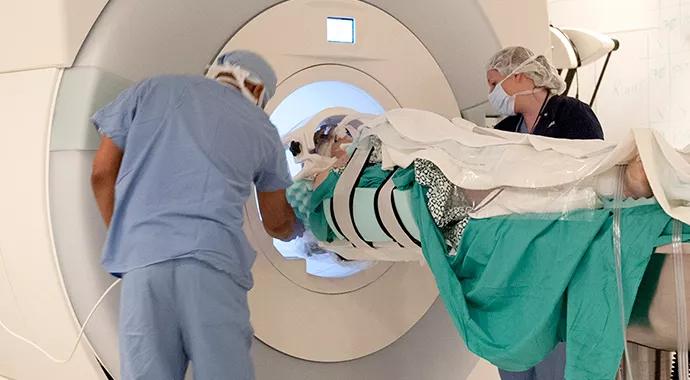 Cleveland Clinic constructed its intraoperative MRI suite with a special infrastructure consisting of two adjacent rooms — a leading-edge operating room and an MRI suite (Figure 1, right) — separated by mechanical doors. At any time during the operation, the surgeon can request an MRI to assess the location of DBS leads and make corrections as necessary. The mechanical doors open and the MRI machine moves on ceiling-mounted rails into the surgical field. Once images are acquired, they can be overlaid on the initial surgical plan to assess any deviation between the actual location of DBS leads and the intended plan.