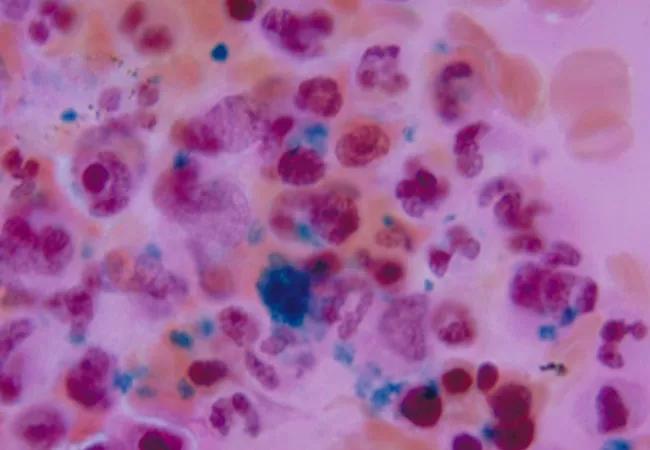 Image: Photomicrograph of a Prussian blue-stained bone marrow smear. Source: CDC Public Health Image Library.