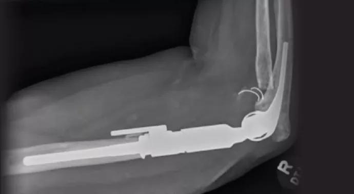 A 63-year-old woman presented to Cleveland Clinic with pain and loss of function of the elbow in her dominant arm. Five years earlier, she had sustained a closed distal humerus fracture that was treated with plate fixation and off-label use of the Sorbie prosthesis (Wright Medical Technology) for hemiarthroplasty. She returned to work in a law office but had increasing pain in the affected elbow over time.