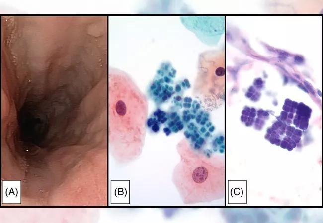 Feature image: Morphology of Sarcina. A, Upper endoscopic photograph of esophagus taken at the time of brushing for Sarcina diagnosis, endoscopic impression of “esophagitis, rule out Candida,” B, Esophageal brushing with mature squamous epithelial cells and large cyanophilic cocci arranged in tetrads, S. ventriculi (ThinPrep, Papanicolaou stain, 1000×), C, Gastric mucosal biopsy taken four months prior to esophageal brushing with large, cuboidal, basophilic bacteria in tetrads, S. ventriculi (Hematoxylin & eosin stain, 1000×). Used with permission from Diagnostic Cytopathology.