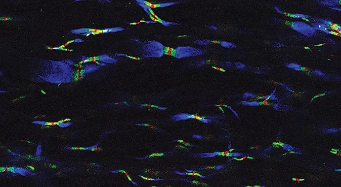 We set about to develop a method for visualizing the nodes of Ranvier, both in healthy and in inflamed mouse spinal cord sections. We used confocal microscopy, which allowed us to focus on a flat focal plane less than 0.5 μm thick. This approach enabled us to see very small structures at quite high resolution. We performed pilot studies using dozens of tissue markers and many different ways of preparing spinal cord tissues for our studies.