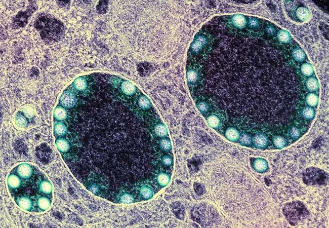 Image: Transmission electron micrograph of SARS-CoV-2 virus particles (teal) within endosomes of a heavily infected nasal olfactory epithelial cell. Image captured at the NIAID Integrated Research Facility in Fort Detrick, MD. Credit: NIAID.