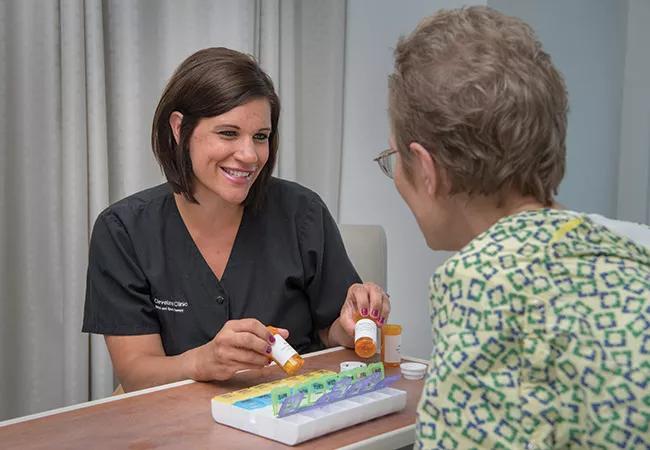 A frequent challenge is medication management, particularly in cases of polypharmacy. So OTs use medication kits consisting of bottles of various sizes and shapes containing different-colored tablets and capsules (see photo). They ask patients to try to open the bottles, distinguish between different medications, read the bottle labels unaided and follow label instructions. “These assessments take a deep dive into issues patients will have when their medical regime is turned over to them at home,” says Green.